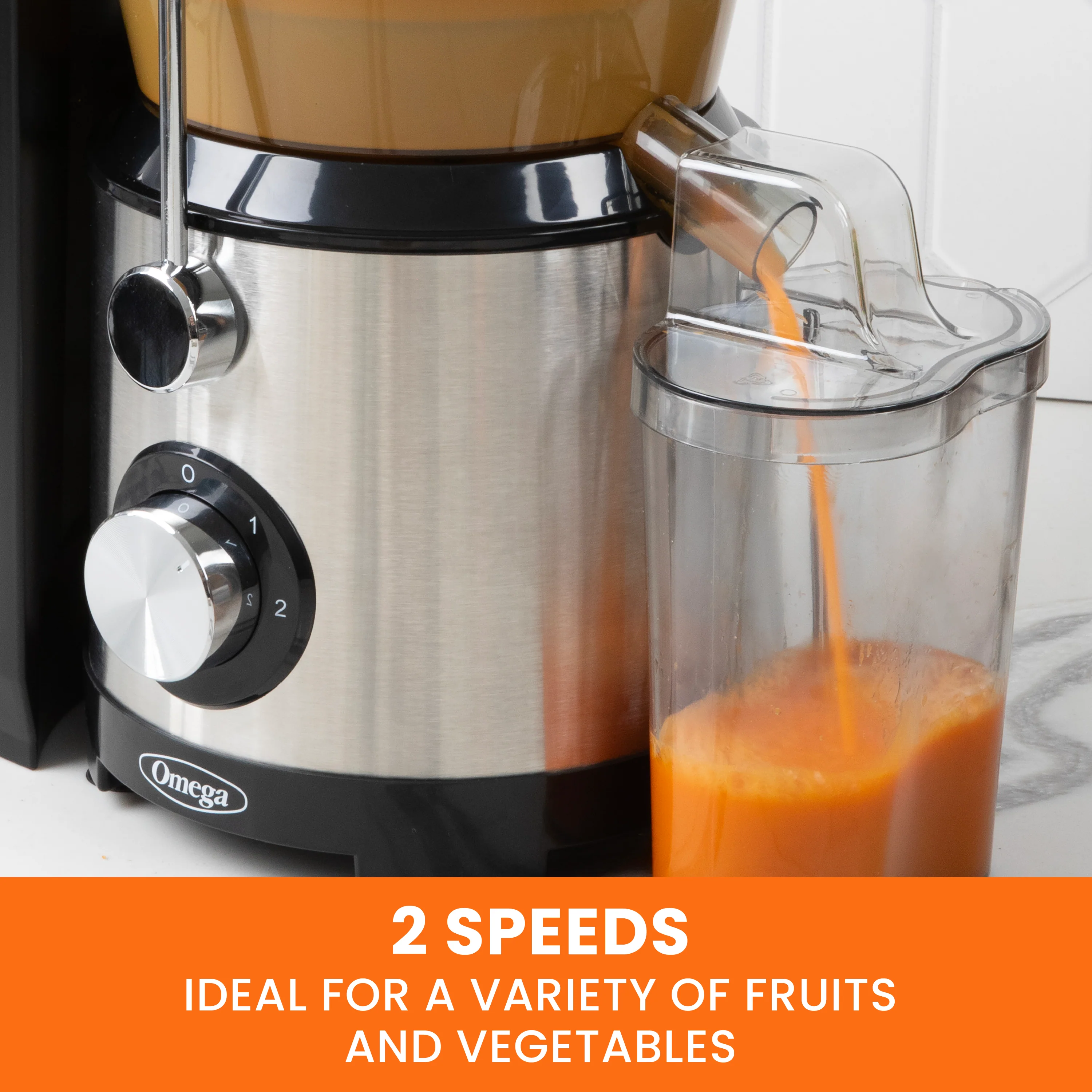 - 2 speeds to accommodate a variety of fruits and vegetables from soft to hard.